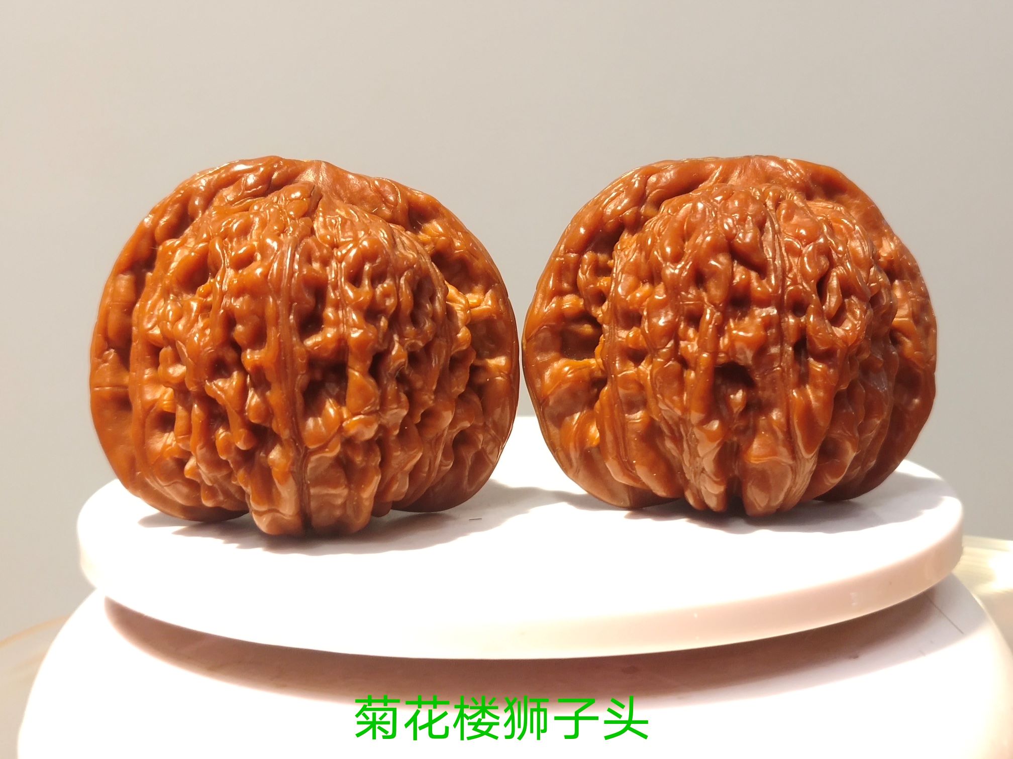 坚果外壳近于圆球形,果底大而平,矮桩,花纹形如雄狮鬃毛,多卷花、绕花、狞花,纹路较深